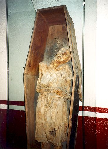 The Bradbury Episode Fear on Four producer Martin Jenkins asked the writer Brian Sibley if he had any ideas for stories for the series. At the time, Sibley didn't have any suitable ideas of his own, but he had recently seen a picture book entitled The Mummies of Guanajuato, which contained Ray Bradbury's story "The Next in Line" illustrated with photographs by Archie Lieberman. Sibley thought this chilling Mexican tale - about a man with a curious fascination with mummies - would make an excelent entry in the series, and offered to adapt it for Jenkins. Sibley's dramatisation is quite straightforwardly faithful to Bradbury's original story, with the exception of the ending, which he found it necessary to adjust. Whereas Bradbury's story ends with a visual image, Sibley had to find a dialogue-based method of concluding it. Sibley says he wanted to capture the intensity of "the incredibly neurotic woman"at the heart of Bradbury's story. He took part of his inspiration from a recording of Agnes Moorhead in Louise Fletcher's "Sorry, Wrong Number", an episode of Suspense first broadcast in May 1943, and subsequently filmed. The Moorehead recording is available here; to read more about the film and story, click here. Brian Sibley is a broadcaster and writer, known for his classic BBC Radio 4 dramatisation of Lord of the Rings, for his Disney documentaries, and all sorts of other things. He has his own website, and is an unstoppable blogger. The success of "The Next in Line" prompted Martin Jenkins and Brian Sibley to create Ray Bradbury's Tales of the Bizarre, an antholgoy series hosted by Bradbury himself, and broadcast on BBC Radio 4 from 1995-97. Episodes of Fear on Four are available for download at vicandsade.net. The Bradbury/Sibley episode is available here. [Source: Brian Sibley; photo of mummy: http://www.masters.me.uk/PhotoTravelogue/Mexico.htm]
