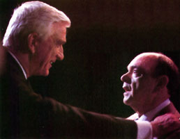 This production includes a substantial amount of new material, and some significant changes in characterisation from the short story. Virtually everything up to Braling and Crane arriving at Braling's house to look through the window is new in this version. What Bradbury has done is fill in the back story, making a drama out of the mystery of Marionettes, Inc. This technique proves to be a standard method of making some of the shorter stories fit into the twenty-five minute running time of Ray Bradbury Theater. Although it has worked on this occasion, there is a sense in which the smartness of the original story is diluted. The young Bradbury knew very well the impact of the Edgar Allan Poe approach to short story writing: begin the story with the plot already well underway, approaching crisis point. The new material now makes Mrs Crane a proper character, and what a character! There is no doubt as to Braling's unhappiness in this version, and his motivation is absolutely plain to see - and rather more wholesome than in the short story, where it is strongly implied that Braling had been forced to marry his wife because she was going to falsely accuse him of assault. Braling Two is also something more of a character. Coco's efforts in making the two versions of himself distinguishable have brought us a much more sensitive Braling Two, and in turn given us the impression that Braling One does actually love his wife (hence his jealousy), helping to explain why he has put up with her all these years. There is also evidence here of Bradbury's ideas spilling over from one story to another. His Fantoccini company, originated in "Marionettes, Inc" (1949), would be revisited in "I Sing the Body Electric" (1962), where the slogan "We shadow forth" is introduced. That same slogan is carried forward into this Ray Bradbury Theater production. Finally, this episode should be a lesson for those who claim Bradbury can't write realistic dialogue. James Coco seems to have no trouble bringing his lines to life - in two characters. Maybe, just maybe, the apparent problem of realistic dialogue in productions such as Something Wicked This Way Comes is more a problem of acting or directing talent... |